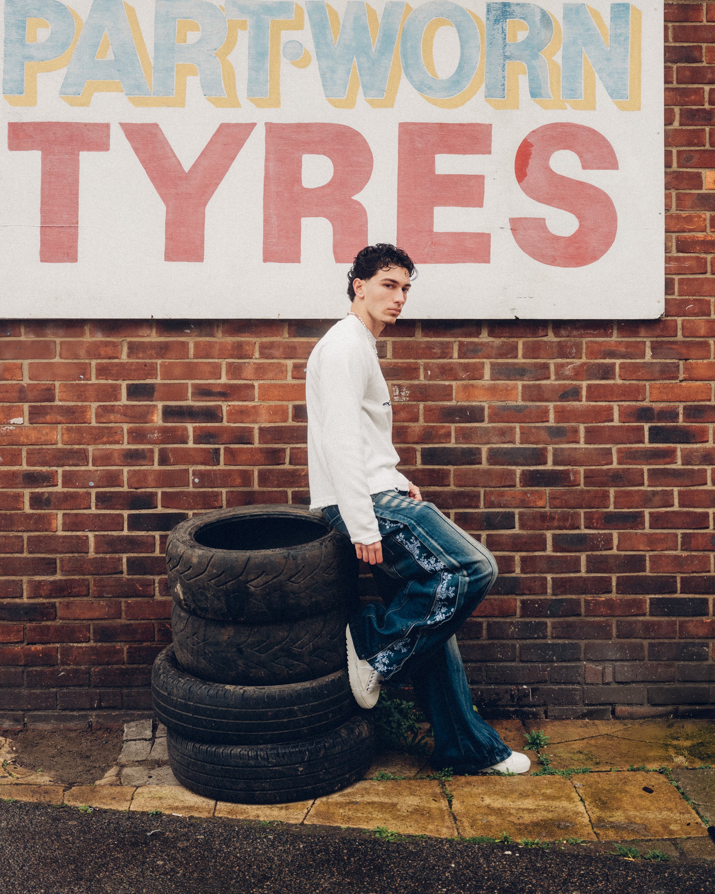 FLORAL ZIP JEANS WASHED BLUE
